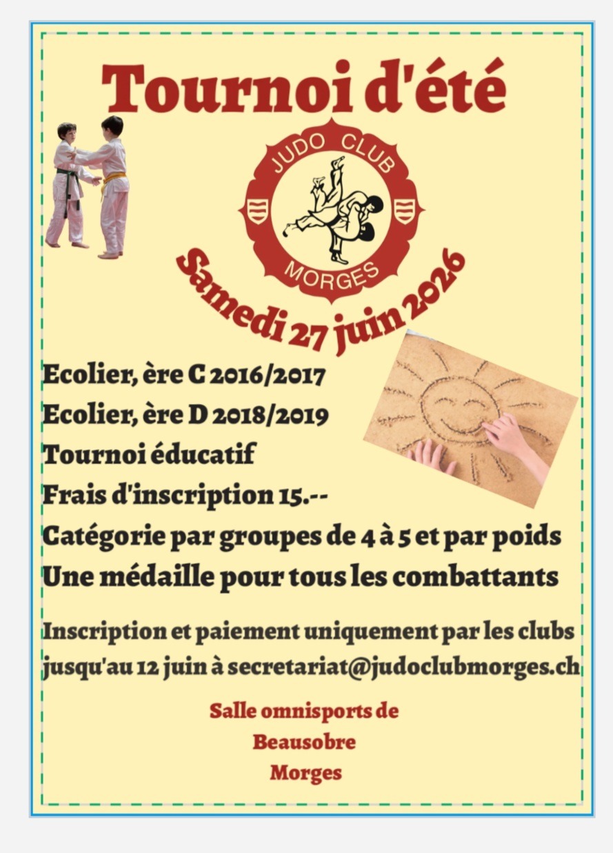 Le premier week-end des vacances, nous vous convions à notre tournoi d’été spécialement conçu pour nos jeunes judokas filles et garçons. Ce tournoi est une belle occasion de se mesurer lors de combats amicaux, de marquer le début de l’été, de permettre à vos jeunes athlètes de briller et de s’amuser tout en apprenant.